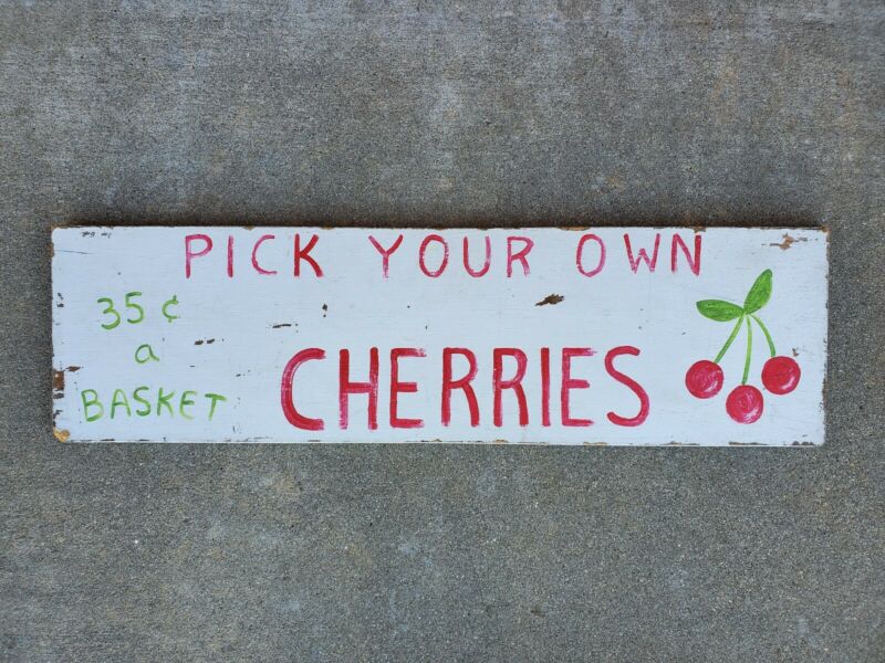 Vtg Cherry Picking Wooden Sign Fruit Farm Store Advert crate kitchen decor