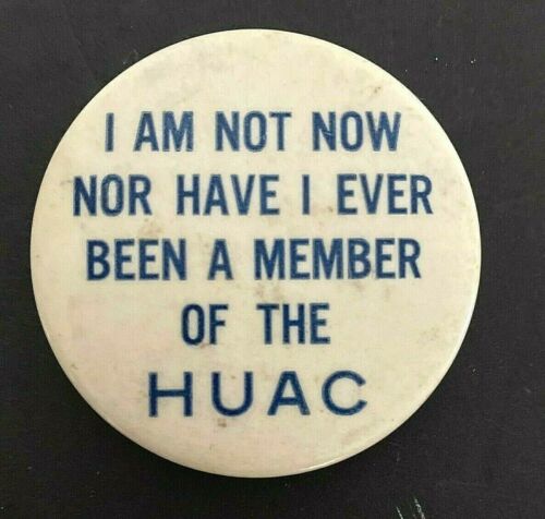 Title (ebay affiliate link): I AM NOT NOW NOR HAVE I EVER BEEN A MEMBER OF THE HUAC PINBACK 1960S ERA PROTEST