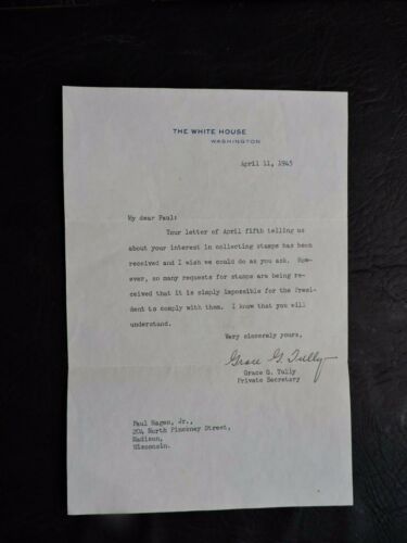 Title (ebay affiliate link): 1945 WHITE HOUSE LETTER SIGNED FDR SECRETARY GRACE TULLY ! PRESIDENT ROOSEVELT !