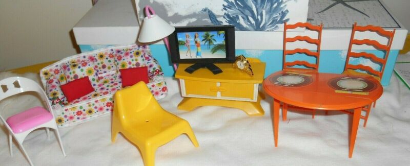Title (ebay affiliate link): 10 Piece Lot Barbie Furniture Vintage and New Living Dining Rooms Mantle Clock