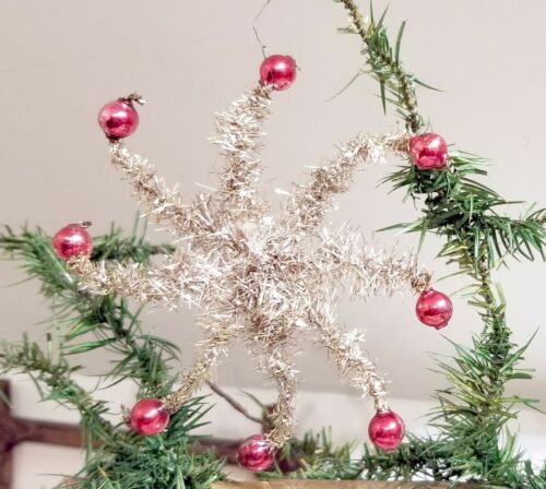 Title (ebay affiliate link): Tinsel Pinwheel, with tiny Red Glass Beads. Early 1900s Silver Tinsel Ornament