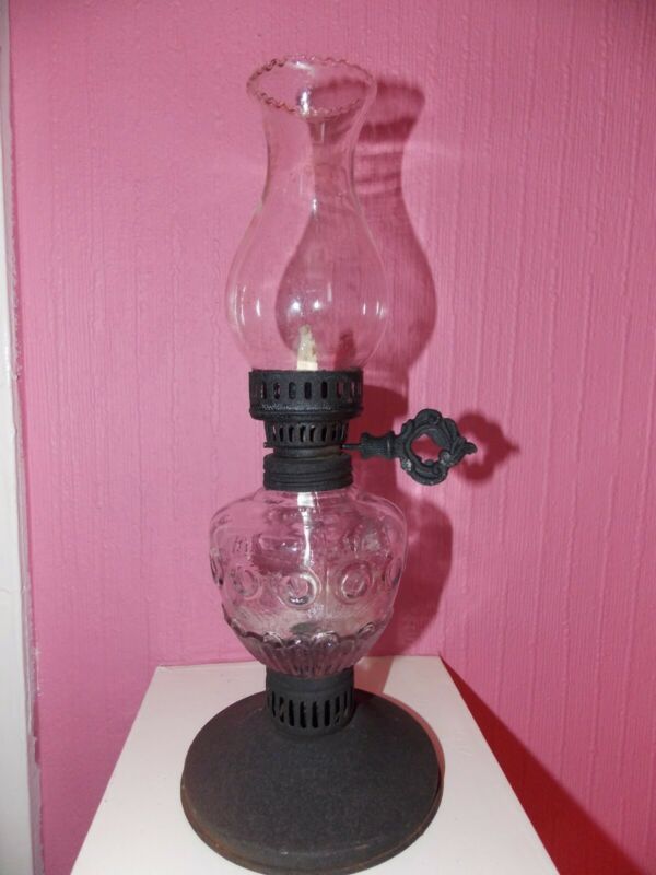 BLACK METAL AND CLEAR GLASS OIL LAMP