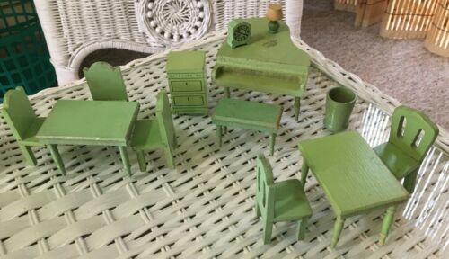 Title (ebay affiliate link): 13 PIECES OF VINTAGE WOODEN DOLL HOUSE FURNITURE GRAND PIANO & BENCH +TABLES ++