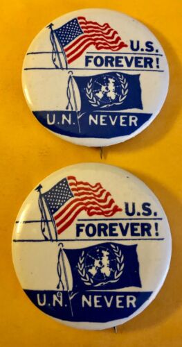 Title (ebay affiliate link): Pair of 1 3/4" U.S. Forever-U.N (United Nations) Never Political Pinback Button
