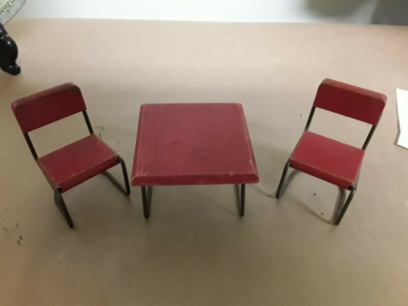Vintage 3 Pc Doll House Miniature Furniture Table Chairs Red Wooden & Metal