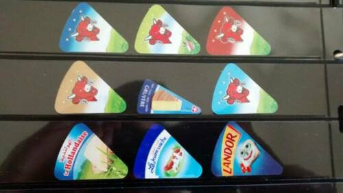 Title (ebay affiliate link): Lot of 9 Cheese Triangle Labels Laughing/Young Cow, Swiss Knight, Landor, +more