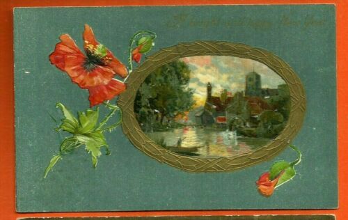 Title (ebay affiliate link): New Year embossed postcard/ green bkgrd/ orange wild roses/ gold oval around pic