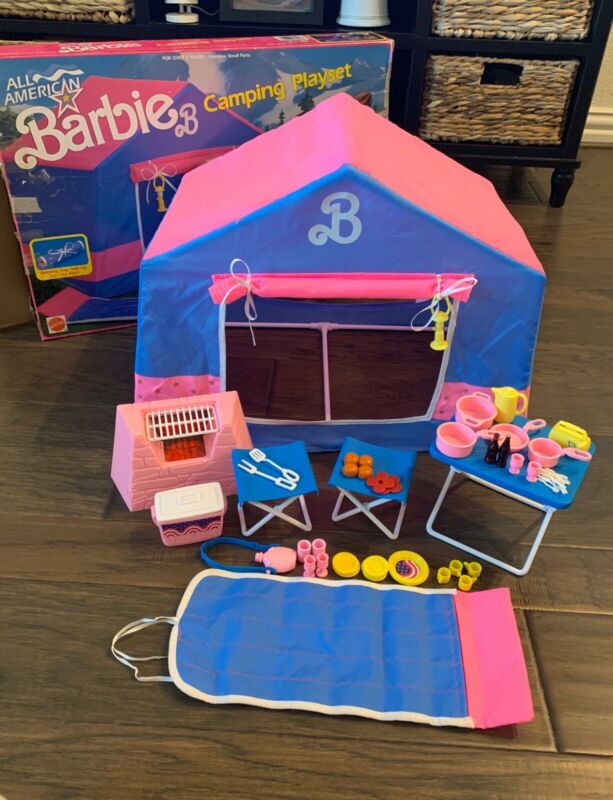 Vintage Barbie Camping Set Tent Grill Furniture Food Utensils Sleeping Bag 1989