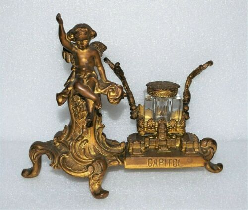 Title (ebay affiliate link): ANTQIUE VICTORIAN ANGEL Capitol Pen Rest Inkwell NICE 1800''s GILT METAL INKSTAND
