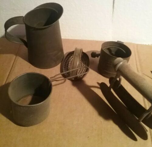 Title (ebay affiliate link): ANTIQUE VINTAGE KITCHEN UTENSIL FARM HOUSE DECOR LOT PITCHER SIFTER