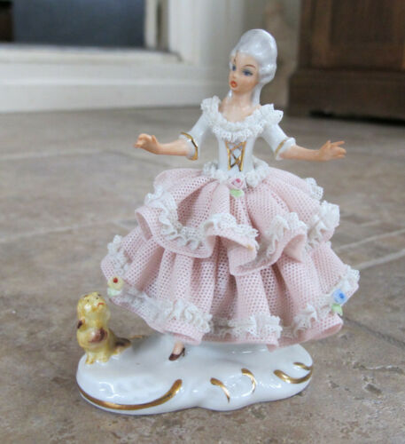 Title (ebay affiliate link): PINK VINTAGE Sandizell Singing Figurine, Dresden Lace Skirt, W.Germany