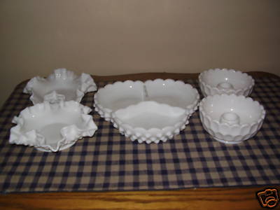 5 PC HOBNAIL MILK GLASS CANDY DISH CANDLE NAPPY FENTON