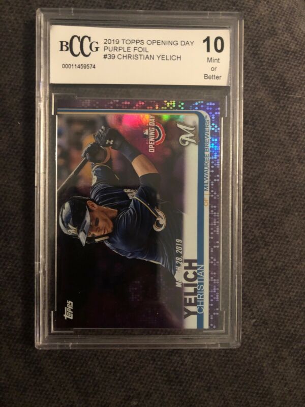Title (ebay affiliate link): Christian Yelich 2019 Topps Opening Day Purple Foil #39 BCCG Graded 10 Mint