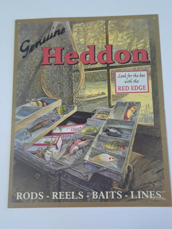Title (ebay affiliate link): Fishing tin sign HEDDON open TACKLE BOX WITH colorful lures, boxes, and reel.