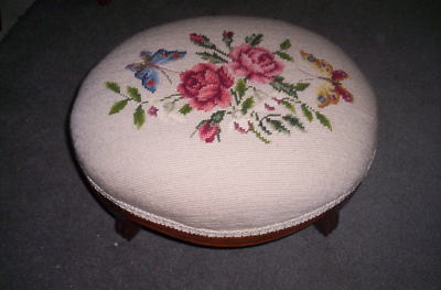 VINTAGE HAND NEEDLEPOINT FOOTSTOOL ROSES/BUTTERFLIES