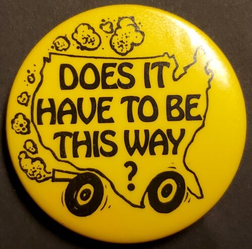 1970s DOES IT HAVE TO BE THIS WAY Pinback Vintage GREEN MOVEMENT Ecology Protest