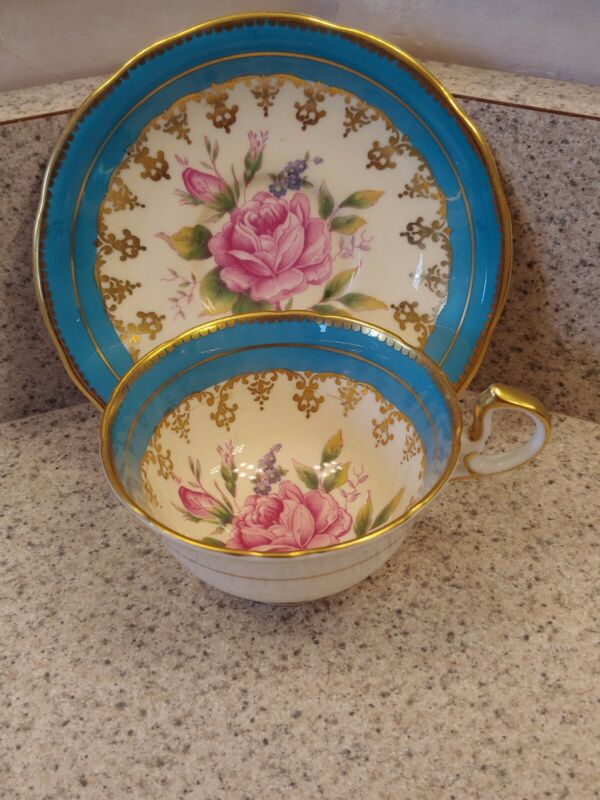 Vintage Aynsley Bone China Cup & Saucer England Teal Gold Center Rose Bold Color