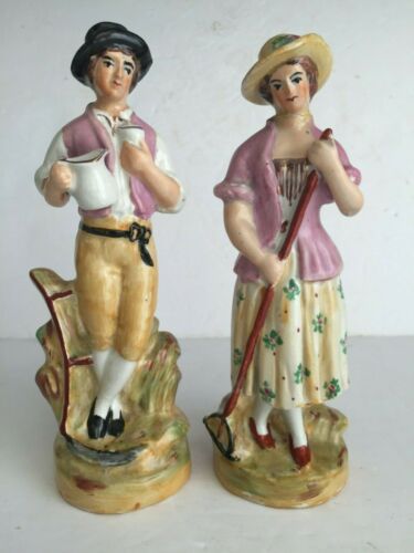 Title (ebay affiliate link): Pair Antique Staffordshire Pottery Figures HARVEST COUPLE Man w Milk Her w Rake