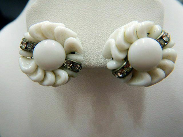 Title (ebay affiliate link): Vintage Clip On Earrings White Milk Glass Round Swirls w/ Rhinestones