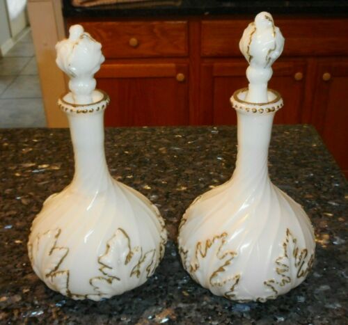 White Milk Glass Decanters w Stopper Leaf Pattern Antique Opaline Swirls w Gold