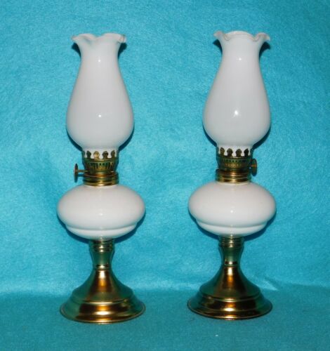 Pair vintage miniature milk glass and brass oil lamps 10 1/2 inches tall