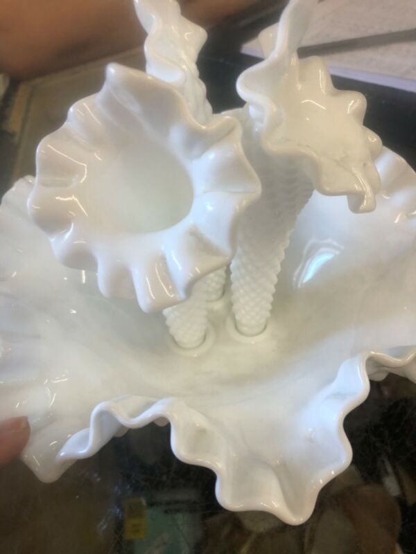 Title (ebay affiliate link): Vintage Fenton Three Horn Hobnail Milk Glass Epergne Centerpiece