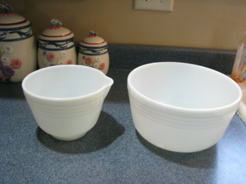 Title (ebay affiliate link): Vintage Hamilton Beach Mixer Model G Set Of 2 Milk Glass Pyrex Mixer Bowls