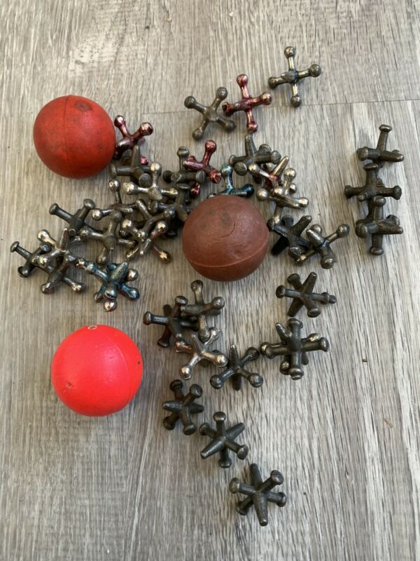 Title (ebay affiliate link): 39 Vintage Ancient Game Knucklebones Jacks Tali Rubber Balls Metal Jacks Classic