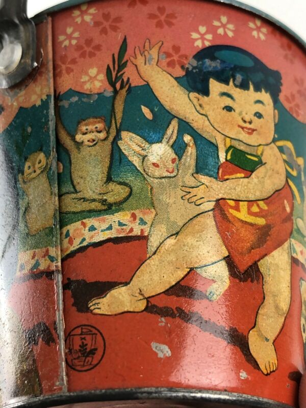 Vintage 1950s Japanese Tin Litho Sand Pail Bucket Samurai Boy Defeating Bear MCM