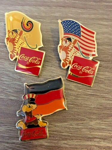 Title (ebay affiliate link): Lot of 3 Coca Cola Olympic Pins 1984 1988 USA Seoul Germany Flags Mascot Pinback