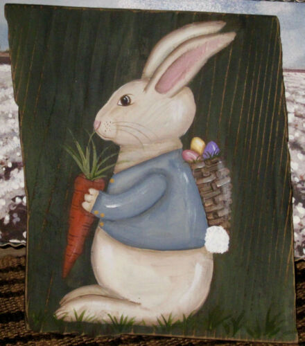 *~*PRIMITIVE*~* HP FOLK ART PRIM BUNNY *~* BASKET OF EGGS *~* RECLAIMED WOOD
