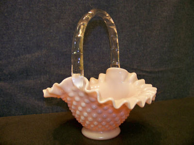 Fenton Pink Milk Glass Hobnail Ruffled Basket