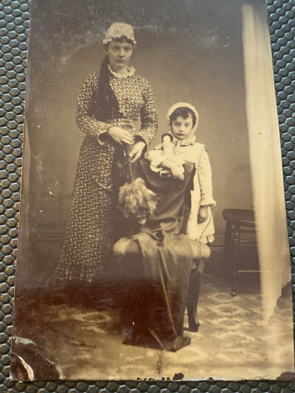 Title (ebay affiliate link): Tintype Rare Antique Photo mother and daughter with creepy doll and duster?