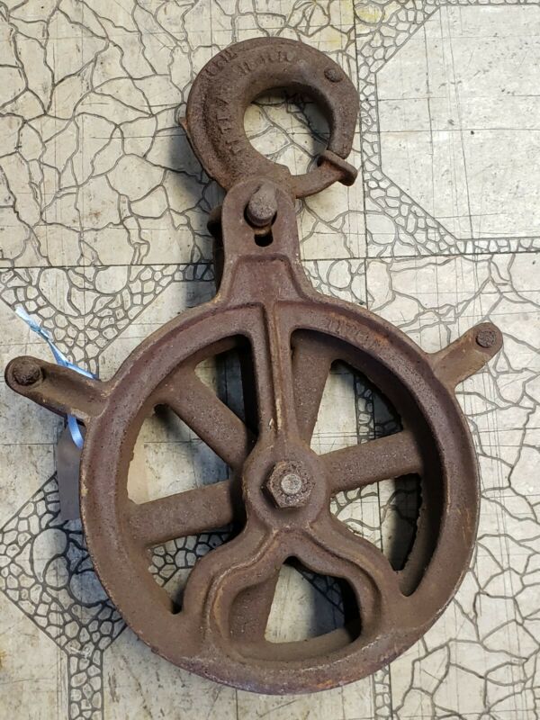 Title (ebay affiliate link): VINTAGE LARGE HEAVY CAST IRON FARM BARN HAY PULLEY primitive steam punk