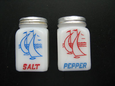 VINTAGE Milk Glass SAILBOAT Salt & Pepper Shakers SUPER