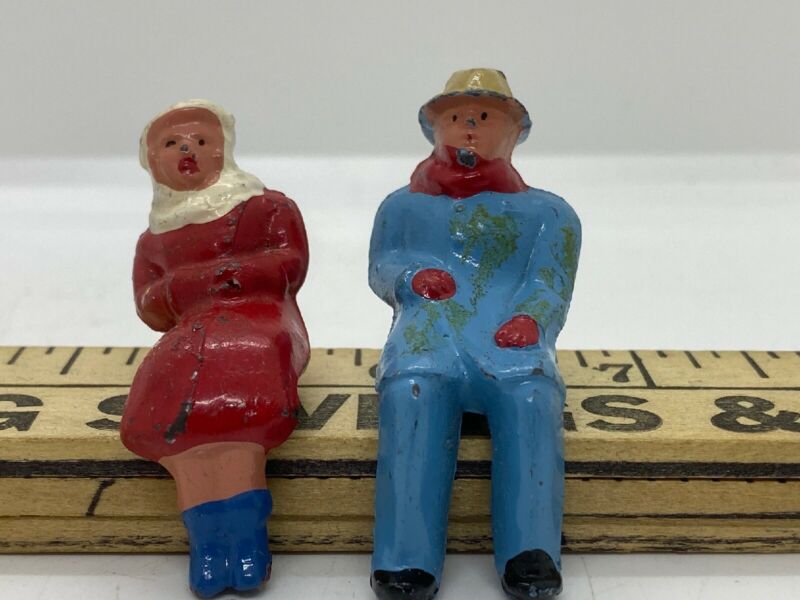 Title (ebay affiliate link): Vintage Happy Farmer Winter Scene Man & Women Sitting Metal Toy Figurines