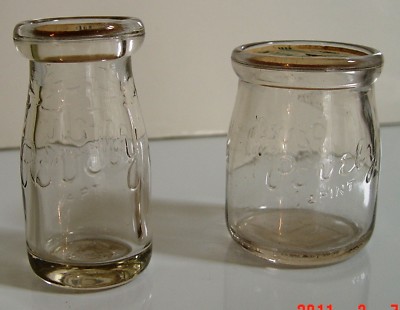 2 VINTAGE GLASS PEVELY MILK BOTTLES