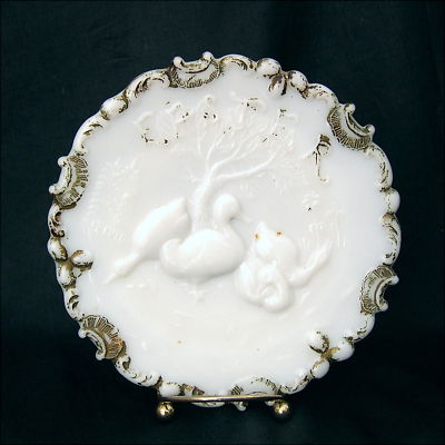 Milk Glass EASTER PLATE w/Ducks Gold Deco c 1910 Kemple