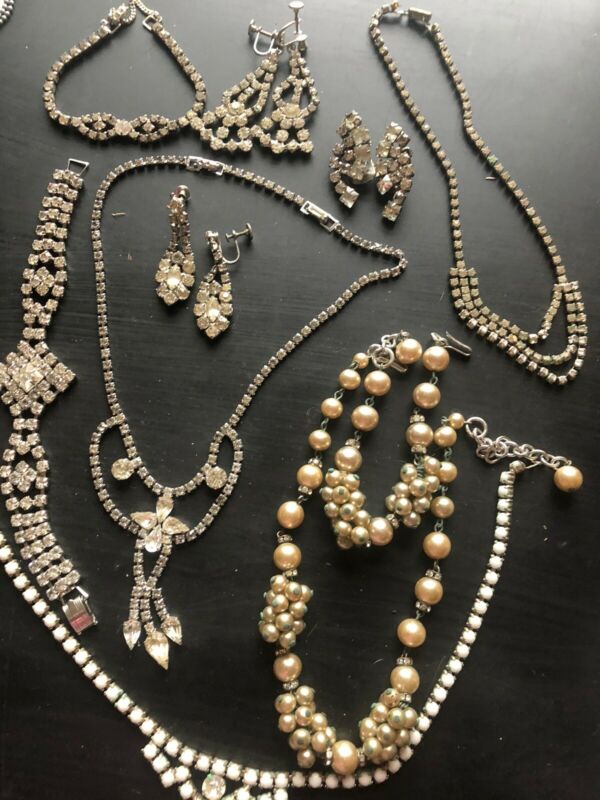 Title (ebay affiliate link): Vintage Jewelry Lot Rhinestone Necklace Bracelet Pins Milk Glass Bead Sets