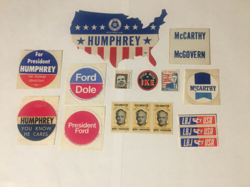 16 Political Stamps & Stickers: Ike, Kennedy, LBJ, Goldwater, Humphrey, Nixon