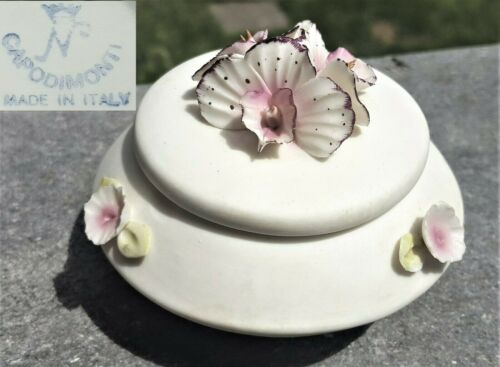 Title (ebay affiliate link): 3.5" Round Bisque CAPODIMONTE Porcelain TRINKET BOX White Flowers Vintage Italy