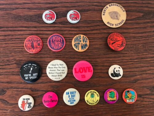 Title (ebay affiliate link): Vtg pin-back buttons Paula panda love war peace sportmen''s club high school bird