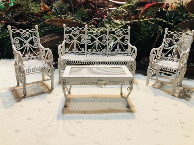 Title (ebay affiliate link): 4 PC LOT OF MINIATURE WHITE METAL WIRE FURNITURE Wicker Style Rattan Design