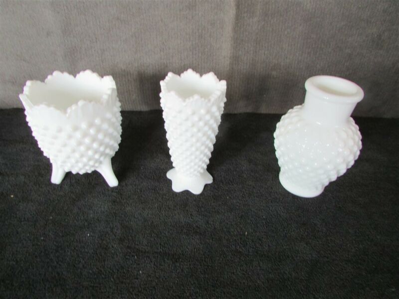 3 White Milk Glass Hobnail Vases D-70