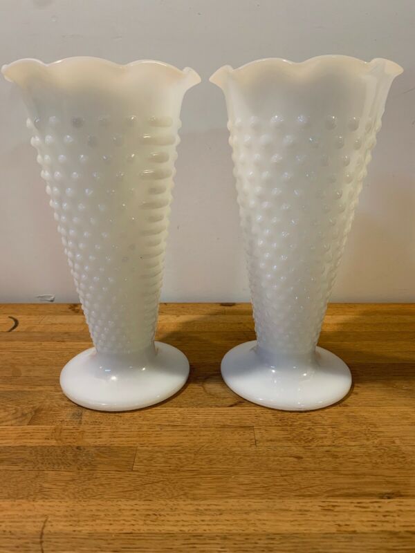 Vintage Hobnail & Bars Milk Glass Fluted Ruffled Vase