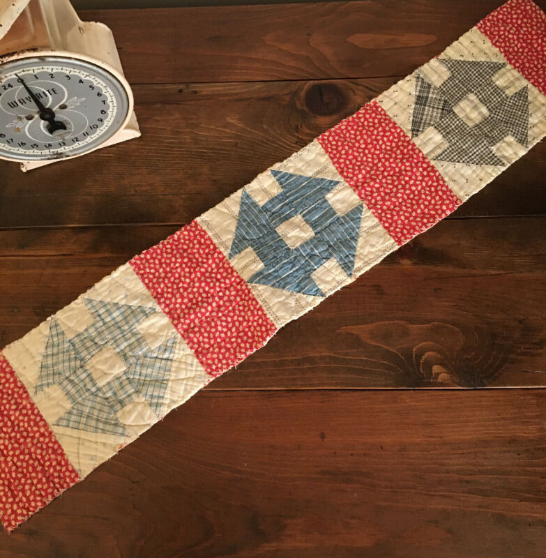 Primitive HOLE IN THE BARN Cutter Quilt Piece TABLE RUNNER Blue Red BARN BENCH