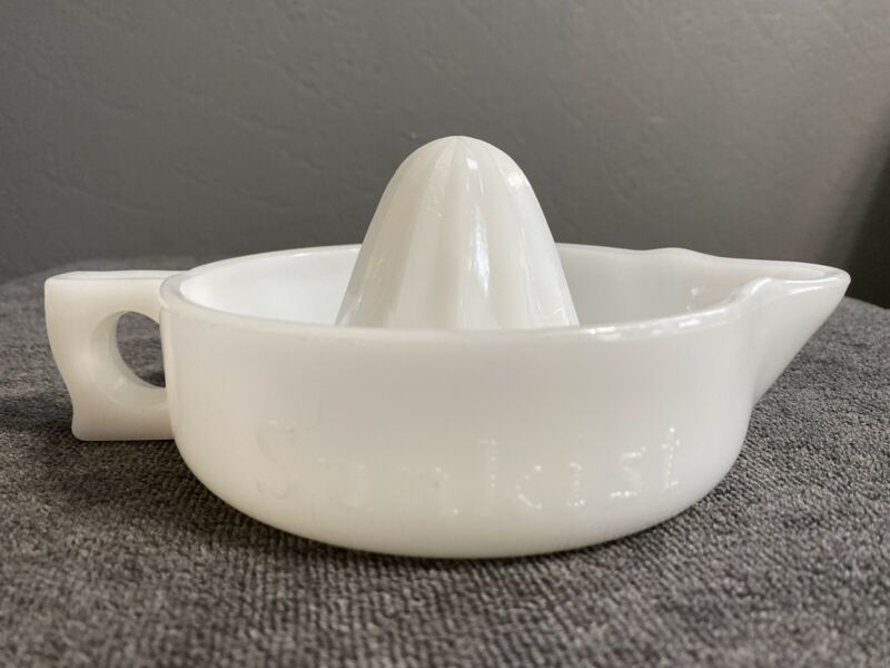 Title (ebay affiliate link): VINTAGE COLLECTIBLE SUNKIST WHITE MILK GLASS JUICER / REAMER