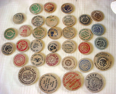 LOT OF 33 VINTAGE WOODEN NICKELS AND 5 WOODEN DOLLARS