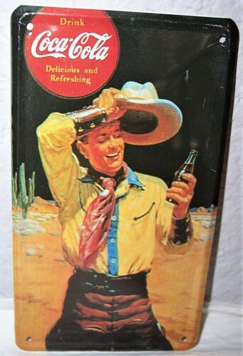 Title (ebay affiliate link): Vintage Mini Coca-Cola Soda Tin Metal Wall Sign Ad Western Cowboy Drink Refresh