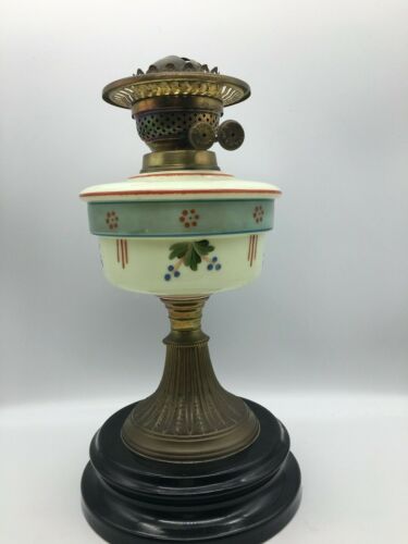 antique green glass and painted oil lamp